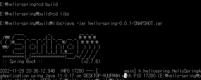 먼저 프로젝트 폴더 경로에 들어간다. (나는 E:\hello-spring이었다.)