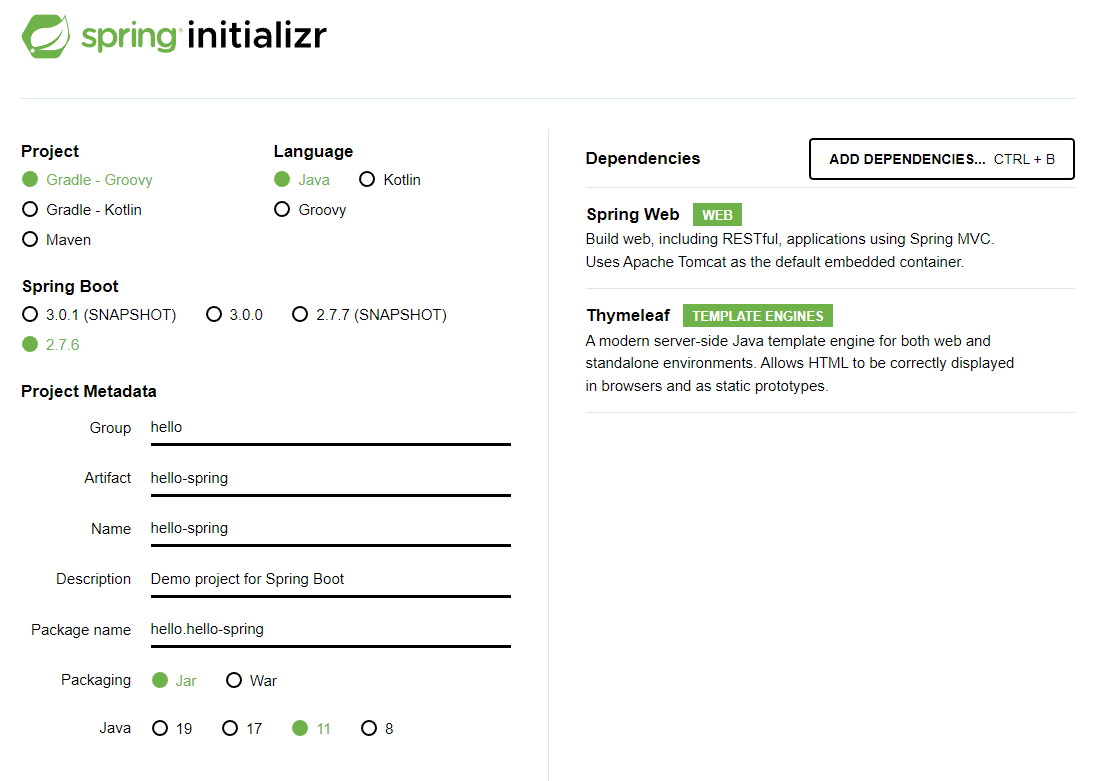 Dependencies는 Spring Web, 그리고 Thymeleaf를 선택했다.