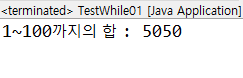 1 2 3 4 5 6 7 8 9 10 11 12 13 | public class TestWhile01 { public static void main(String[] args) { int sum = 0; int i = 1; while(i<=100) { sum +=i; i++; } System.out.println("1~100까지의 합 : " +sum); } } | cs |