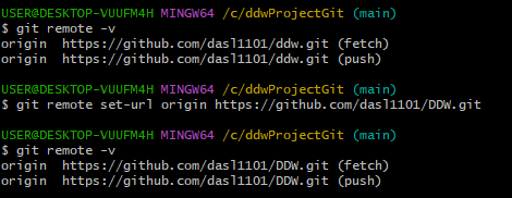 이런 경우 혹시 Git Bash에서 문제가 있을지 몰라서 Git Bash에서 원격 저장소 주소를 변경해주기로 한다.