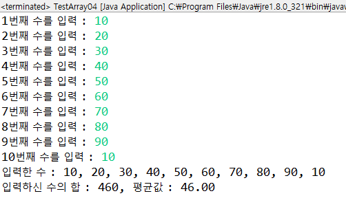 1 2 3 4 5 6 7 8 9 10 11 12 13 14 15 16 17 18 19 20 21 22 23 24 25 | import java.util.*; public class TestArray { public static void main(String[] args) { Scanner in = new Scanner(System.in); int arr[] = new int[10]; int sum = 0; for(int i=0; i<arr.length; ++i) { System.out.print(i+1+"번째 수를 입력 : "); arr[i] = in.nextInt(); sum += arr[i]; } System.out.print("입력한 수 : "); for(int i=0; i<arr.length-1; ++i) { System.out.print(arr[i] + ", "); } System.out.println(arr[arr.length-1]); System.out.printf("입력하신 수의 합 : %d, 평균값 : %.2f\n" ,sum, sum/(float)arr.length); } } | cs |