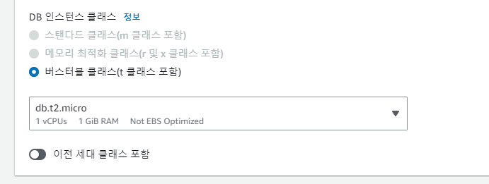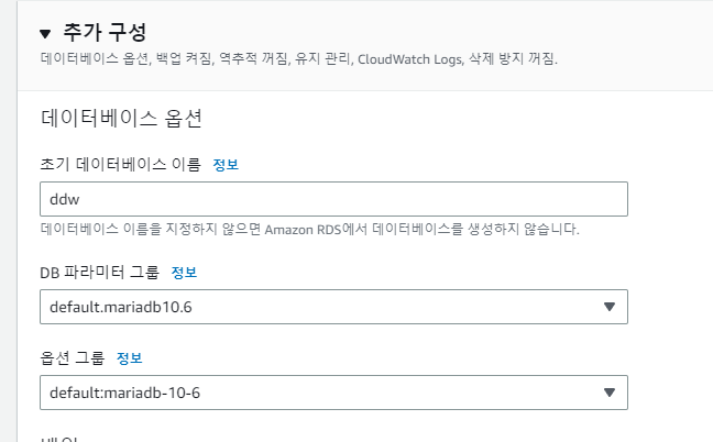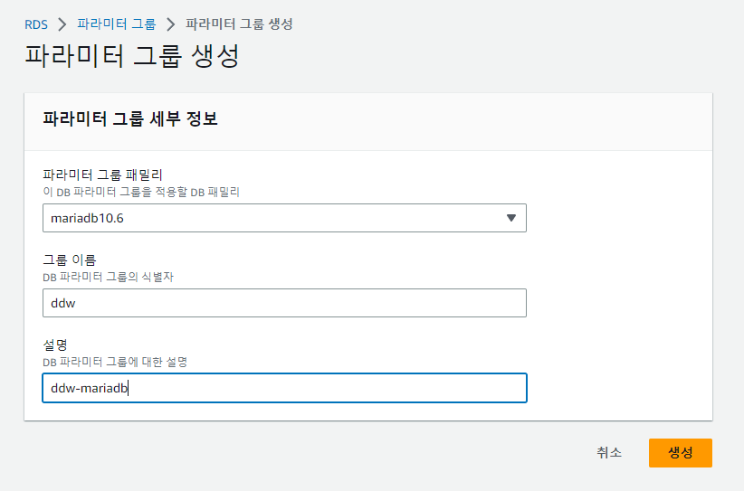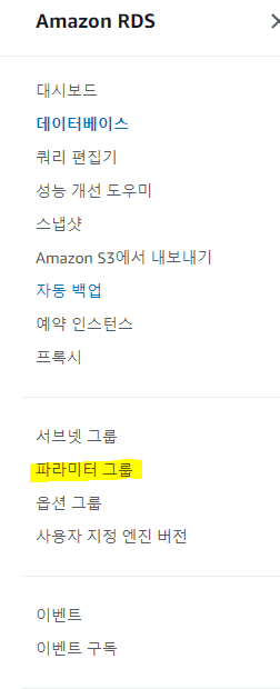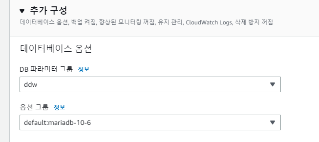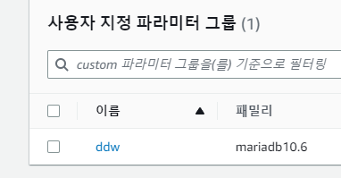 쭉 내려오면 DB파라미터 그룹이 있는데 아까 만든 것을 선택한다.