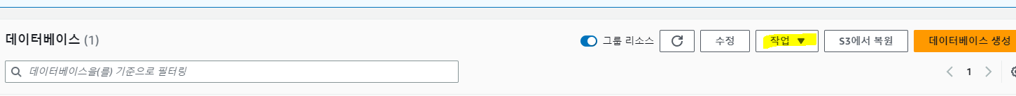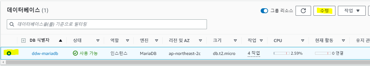 수정사항을 적용하기 위해 왼쪽 메뉴의 데이터베이스를 클릭한 후, 처음 생성한 인스턴스의 라디오버튼을 클릭 후 수정을 클릭한다.