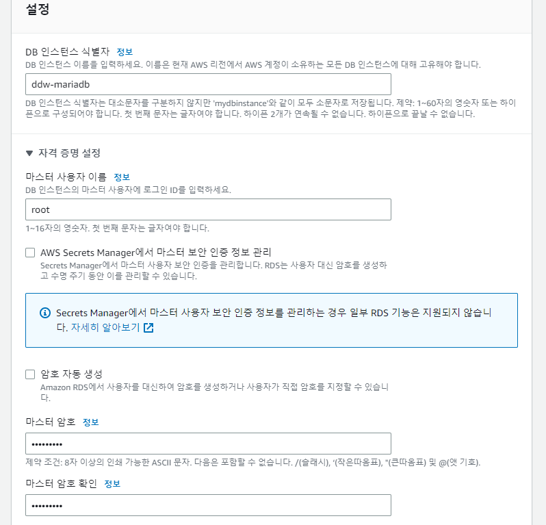 설정에서 정보들을 기입한다. 마스터 사용자 이름은 MariaDB에서는 root라서 root로 적어주었다.