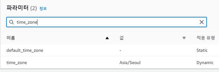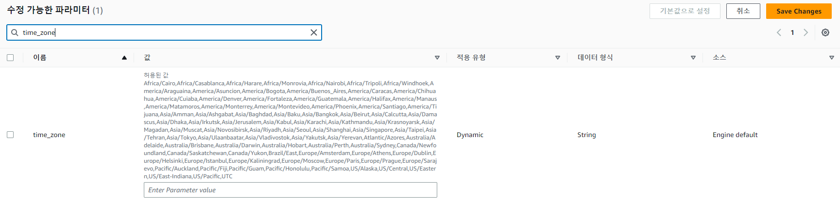 time_zone을 검색하면 위와 같이 뜨는데 Asia/Seoul 을 선택하고 Save Change를 클릭하고 그룹 화면에서 검색해보면