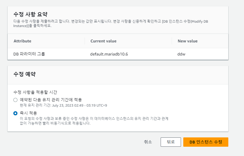 맨아래의 계속 버튼 클릭 후 수정 예약에서 즉시 적용을 선택하고 DB인스턴스 수정을 클릭한다.