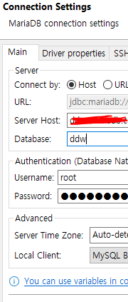 Server Host는 엔드포인트로 지정하고 Database는 db명, Username은 마스터 사용자 이름, Password는 비번을 입력한다.