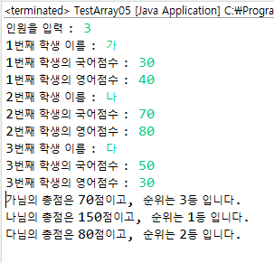 1 2 3 4 5 6 7 8 9 10 11 12 13 14 15 16 17 18 19 20 21 22 23 24 25 26 27 28 29 30 31 32 33 34 35 36 37 38 39 40 41 | import java.util.*; public class TestArray { public static void main(String[] args) { Scanner in = new Scanner(System.in); System.out.print("인원을 입력 : "); int inwon = in.nextInt(); String[] name = new String[inwon];//배열의 크기는 변수로 만들어 줄 수 있다. int[] kor = new int[inwon]; int[] eng = new int[inwon]; int[] tot = new int[inwon]; int[] rank = new int[inwon]; for(int i=0; i<inwon; ++i) { System.out.print(i+1+"번째 학생 이름 : "); name[i] = in.next(); System.out.print(i+1+"번째 학생의 국어점수 : "); kor[i] = in.nextInt(); System.out.print(i+1+"번째 학생의 영어점수 : "); eng[i] = in.nextInt(); tot[i] = kor[i] + eng[i]; rank[i] = 1; } for(int i=0; i<inwon; ++i) {//내성적 for(int j=0; j<inwon; ++j) {//다른사람 성적 if (tot[i] < tot[j]) { rank[i]++; } } } for(int i=0; i<inwon; ++i) { System.out.println(name[i]+"님의 총점은 " + tot[i] +"점이고, 순위는 " + rank[i] +"등 입니다."); } } } | cs |