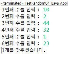 1 2 3 4 5 6 7 8 9 10 11 12 13 14 15 16 17 18 19 20 21 22 23 24 25 26 27 28 29 30 31 32 33 34 35 36 37 38 39 40 41 42 43 44 45 46 47 48 49 50 51 52 53 54 55 56 | import java.util.*; public class TestRandom { public static void main(String[] args) { Scanner in = new Scanner(System.in); int com[] = new int[6]; int select[] = new int[6]; //컴퓨터수 6개를 setting for(int i=0; i<com.length; ++i) { com[i] = (int)(Math.random()*45) + 1; for(int j=0; j<i; ++j) { if (com[i] == com[j]) { i--; break; } } } //사용자수 6개를 입력받자 for(int i=0; i<select.length; ++i) { do { System.out.print(i+1+"번째 수를 입력 : "); select[i] = in.nextInt(); }while(select[i]<1 || select[i]>45); for(int j=0; j<i; ++j) { if (select[i] == select[j]) { i--; break; } } } int co = 0;//같은수가 몇개인지 알려주는 변수 for(int i=0; i<6; ++i) { for(int j=0; j<6; ++j) { if (com[i] == select[j]) { co++; break; } } } System.out.println(co+"개를 맞추셨습니다."); } } | cs |