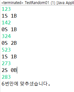 1 2 3 4 5 6 7 8 9 10 11 12 13 14 15 16 17 18 19 20 21 22 23 24 25 26 27 28 29 30 31 32 33 34 35 36 37 38 39 40 41 42 43 44 45 46 47 48 49 50 51 52 | import java.io.*; public class TestRandom01 { public static void main(String[] args) throws IOException { char[] com = new char[3]; char[] select = new char[3]; int co = 0; for(int i=0; i<3; ++i) { com[i] = (char)(Math.random()*9 + 49); for(int j=0; j<i; ++j) { if (com[i] == com[j]) { i--; break; } } } while(true) { int s = 0, b = 0; for(int i=0; i<3; ++i) { select[i] = (char)System.in.read(); } System.in.skip(5); co++; for(int i=0; i<3; ++i) { for (int j=0; j<3; ++j) { if (com[i] == select[j]) { if (i==j) { s++; }else { b++; } } } } if (s==3) { break; }else if (s==0 && b==0) { System.out.println("out"); }else { System.out.printf("%dS %dB\n", s, b); } } System.out.println(co+"번만에 맞추셨습니다."); } } | cs |