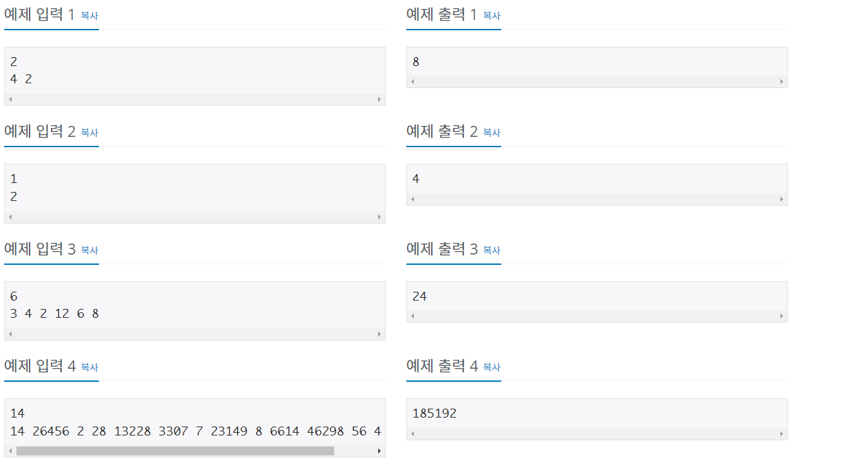 예제를 보면 약수 중 가장 작은 수와 가장 큰 수를 곱하면 N이 나온다는 것을 알 수 있다.