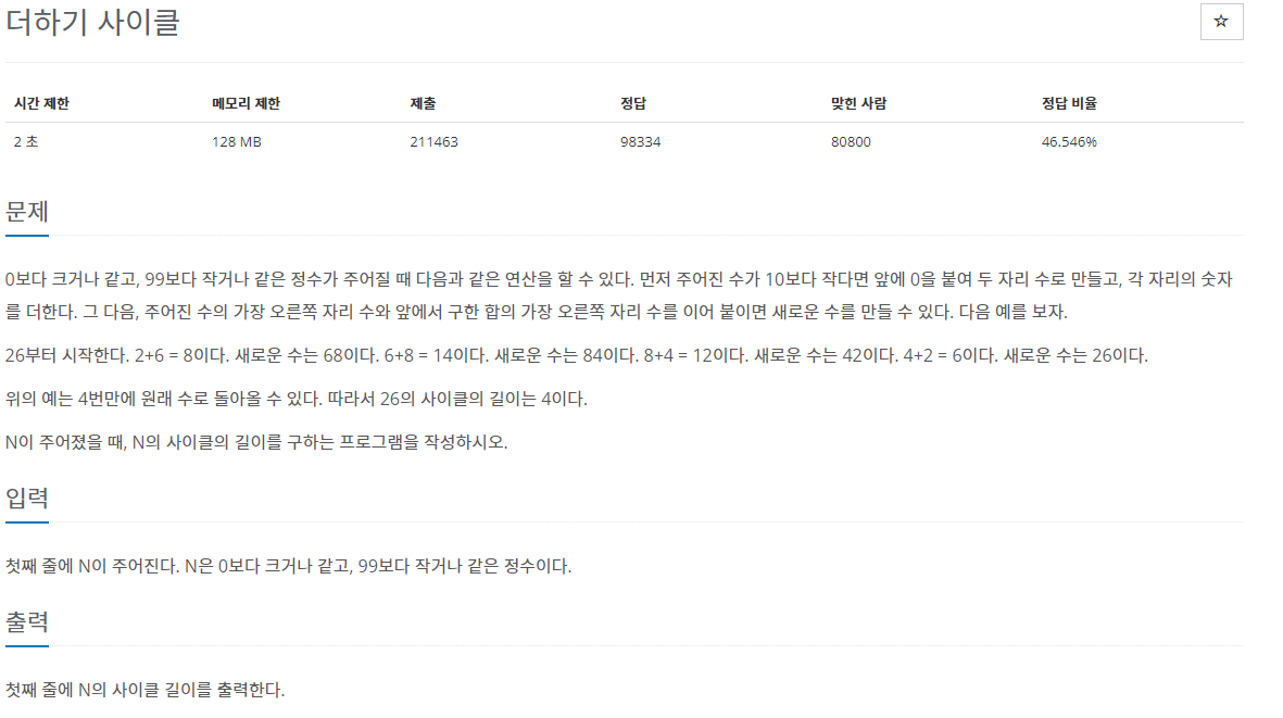 입력받는 수는 N, 십의 자릿수와 1의 자릿수를 a,b 사이클을 돌려서 새로 만들어진 수는 newN으로 설정한다.