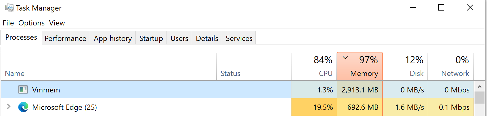 이 문제는WSL2부터 일어나는 문제이며, 도커를 실행시켰을 때 vmmem이라는 프로그램이 운영체제의 모든 잔여 램을 잡아먹어서 생기는 것이라고 한다.