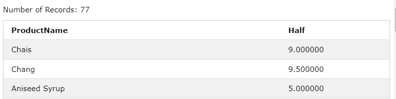 SELECT ProductName, Price / 2 As Half FROM Products;
